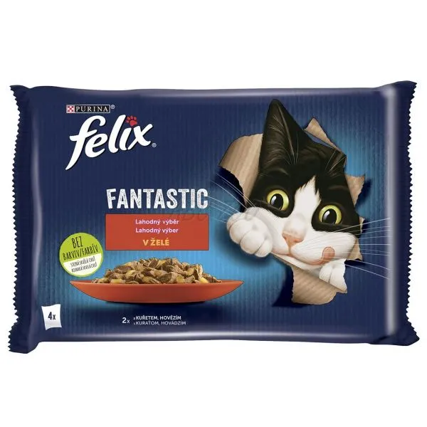 FELIX Fantastic je rad neodolateľných krmív, ktoré vyzerajú, voňajú a chutia tak lahodne ako jedlo, ktoré by ste sami uvarili! Každá receptúra, vyrobená z kvalitných surovín, obsahuje krehké kúsky v želé, aby sa vaša mačka mohla do chutného krmiva poriadne zahryznúť! Zároveň sú zdrojom omega-6 mastných kyselín a majú správnu kombináciu vitamínov, aby udržali vašu mačku plnú energie a pripravenú na neplechu! Sú plné dobrôt a uspokoja 100 % denných potrieb vašej mačky, keď sú podávané podľa návodu na kŕmenie. To nie je všetko! FELIX Fantastic je dostupný v celom rade lahodných receptúr v šťavnatom želé, aby každý deň uspokojil lásku vašej mačky po rozmanitosti. Skutočne chutia tak dobre, ako vyzerajú! FELIX je jednoducho neodolateľný!