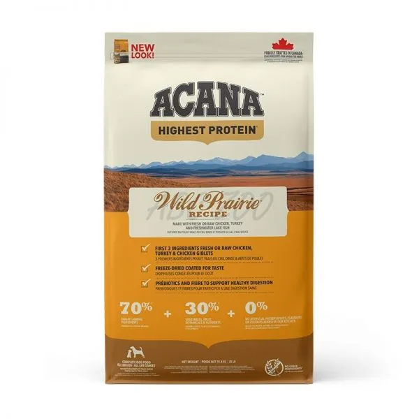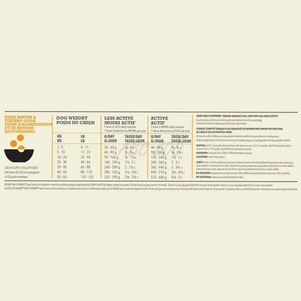 Zloženie: čerstvé kuracie mäso 11 %, čerstvé morčacie mäso 9 %, čerstvé kuracie droby (pečeň, srdce, ľadviny) 9 %, dehydrované kura 9 %, dehydrovaná morka 6 %, dehydrovaný sleď 9 %, celý zelený hrach, celá červená šošovica, celý cícer, čerstvé celé vajcia 4 %, surová sladkovodná jazerná ryba 6 %, kurací tuk 4 %, celá zelená šošovica, celá fazuľa pinto, celý žltý hrach, na slnku sušená lucerna, rybí olej 2 %, vláknina zo šošovice, sušená morská riasa, čerstvá tekvica, čerstvá maslová tekvica, čerstvý paštrnák, čerstvá kapusta, čerstvý špenát, čerstvé listy horčice, čerstvé listy kvaky, čerstvá mrkva, čerstvé jablká red delicious, čerstvé hrušky bartlett, mrazom sušená pečeň (kuracia a morčacia), soľ, čerstvé brusnice, čerstvé čučoriedky, koreň čakanky, kurkuma, ostropestrec, koreň lopúcha, levanduľa, koreň ibiška, šípky, čerstvý kel, čerstvé listy červenej repy, celé plody muchovníka