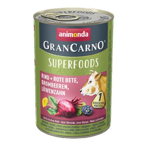 Animonda GranCarno Superfoods je vyvážená konzerva s hovädzím mäsom, červenou repou, černicami a púpavou pre dospelé psy (1-6 rokov) všetkých plemien.
