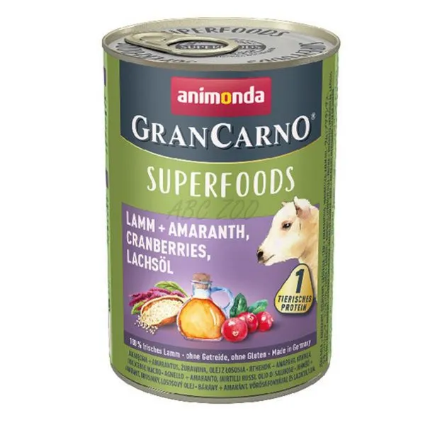 Animonda GranCarno Superfoods je vyvážená konzerva s jahňacím mäsom, amarantom, brusnicami a lososovým olejom pre dospelé psy (1-6 rokov) všetkých plemien.