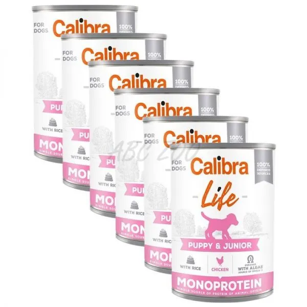Calibra Dog Life Puppy & Junior Chicken with Rice - receptúra konzervy s kuraťom, kuracími srdiečkami a ryžou je kompletným krmivom, ktorá je určená pre šteňatá a je vhodná aj pre gravidné alebo dojčiace sučky.