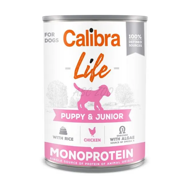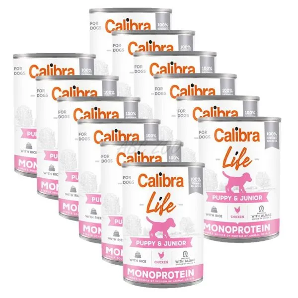 Calibra Dog Life Puppy & Junior Chicken with Rice - receptúra konzervy s kuraťom, kuracími srdiečkami a ryžou je kompletným krmivom, ktorá je určená pre šteňatá a je vhodná aj pre gravidné alebo dojčiace sučky.
