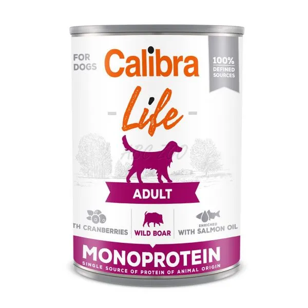 Calibra Dog Life Adult Wild Boar with Cranberries - receptúra konzervy s diviačim mäsom a brusnicami je kompletným krmivom, ktoré je určené pre dospelých psov.