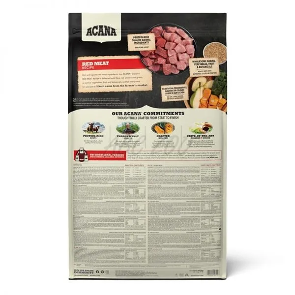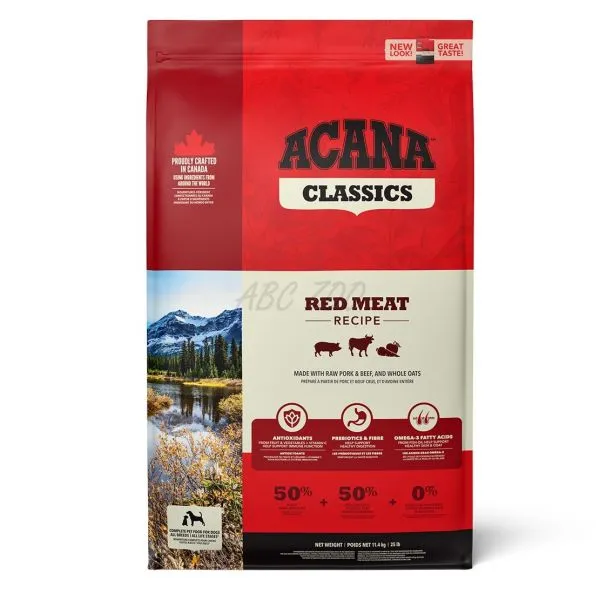 ACANA Classic red je plnohodnotné a biologicky vyvážené krmivo pre psy všetkých plemien a vekových kategórií s jahňacím, hovädzím a bravčovým mäsom.
