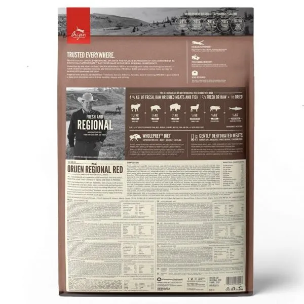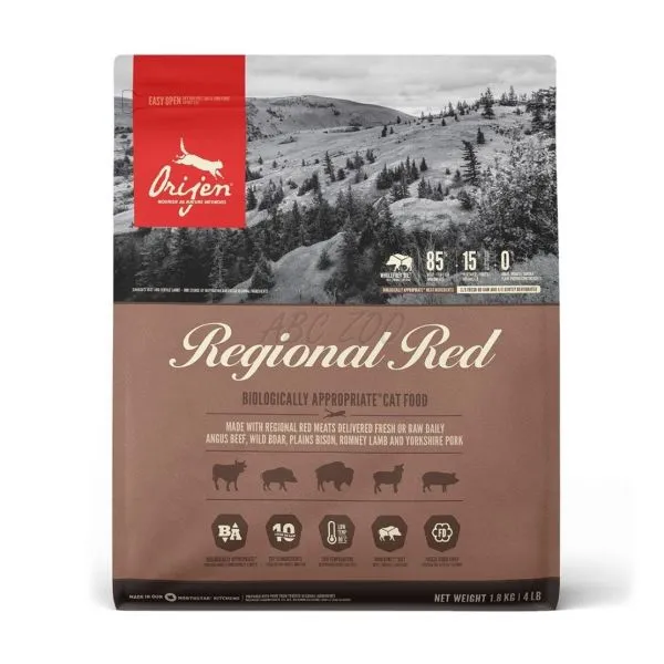 Orijen Regional Red je krmivo z hovädzieho plemena Angus, diviaka, bizóna, jahňaťa plemena Romney a tradičného kanadského bravčového, pre mačky všetkých plemien a všetkých vekových kategórií.