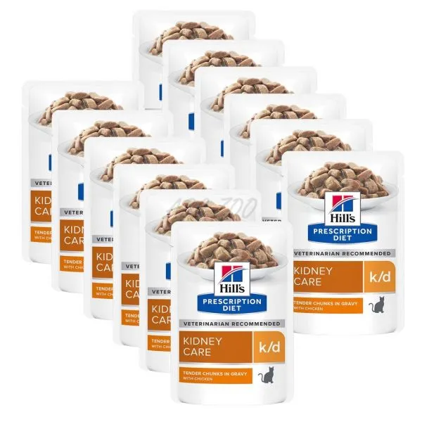 Krmivo pre mačky PRESCRIPTION DIET k/d značky Hill‘s je klinická výživa, ktorá pomáha chrániť životne dôležité funkcie obličiek vašej mačky, zlepšuje jej chuť do jedla a zvyšuje príjem potravy. Toto mokré krmivo pre mačky je stimulantom chuti do jedla pre mačky, u ktorého je klinicky dokázané, že zlepšuje kvalitu života a predlžuje ho. Krmivo PRESCRIPTION DIET k/d je vyrobené z kuracieho mäsa a má lákavú chuť, ktorú si vaša mačka obľúbi.