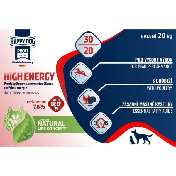 Happy Dog HIGH ENERGY je vyvážené krmivo určené pre aktívne psy stredných a veľkých plemien, ktoré potrebujú vysoký obsah energie a živín na podporu svojich výkonov.
