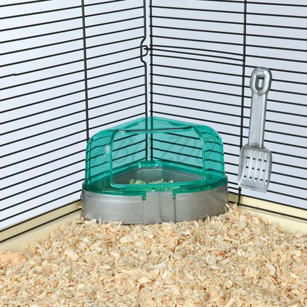 Toaleta má obmedziť znečistenie klietky, je rohová a dodávaná s malou lopatkou, ktorú je možné zavesiť na mriežku. Vrchná časť toalety je z priesvitného plastu vo viacerých farbách s otvorom a spodná časť v sivej farbe. Upozornenie: posielame kus vo farbe, ktorú máme aktuálne na sklade.