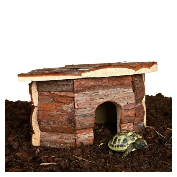 Rohový domček pre hlodavce z dreva s rovnou strechou.