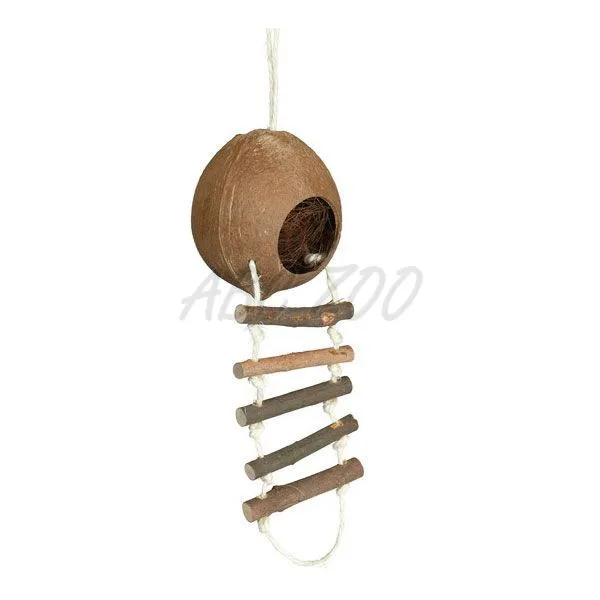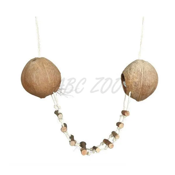 Domčeky z kokosových orechov sú spojené lankami, na ktoré sú pripevnené drievka tvoriace mostík. Kokosové orechy sú ideálne na úkryt, majú otvor a sú vyplnené tenkými vláknami z orechov. Na oboch koncoch je šnúrka s odšrubovateľnými karabinkami pre uchytenie do klietky.