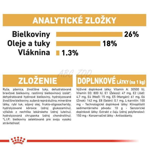 Zoženie: Ryža, pšenica, živočíšne tuky, dehydratované bravčové mäso, izolát rastlinného proteínu (L.I.P. proteín vybraný vďaka svojej vysokej stráviteľnosti), dehydratované hydinové mäso, hydrolyzované živočíšne proteíny, repné odrezky, minerály, rybí olej, sójový olej, fruktooligosacharidy, hydrolyzované kôrovce (zdroj glukozamínu), výťažok z nechtíka lekárskeho (zdroj luteínu), hydrolyzované chrupavky (zdroj chondroitínu).