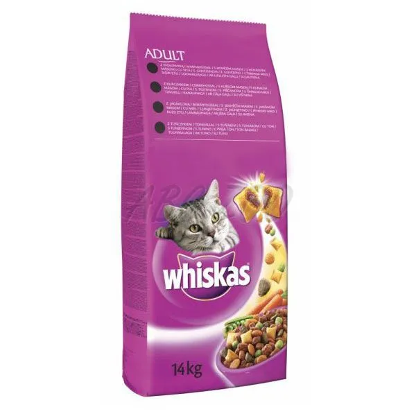 Whiskas Granule s hovädzím mäsom a pečeňovými vankúšikmi 14 kg - krmivo pre dospelé mačky.