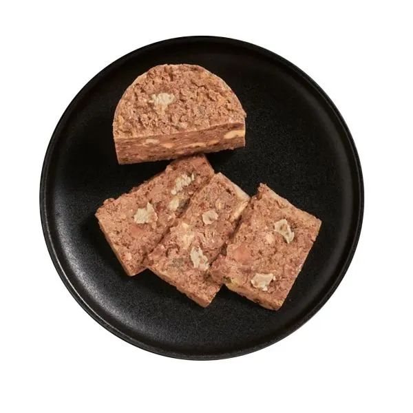 Zloženie: Jahňacie mäso, pečeň, srdce, pľúca, obličky (56 %); Jahňací a kurací vývar (28,8 %); Kuracie filé (14 %); minerály (0,5 %); vaječné škrupiny, sušené (0,5 %); Lososový olej (0,2 %)