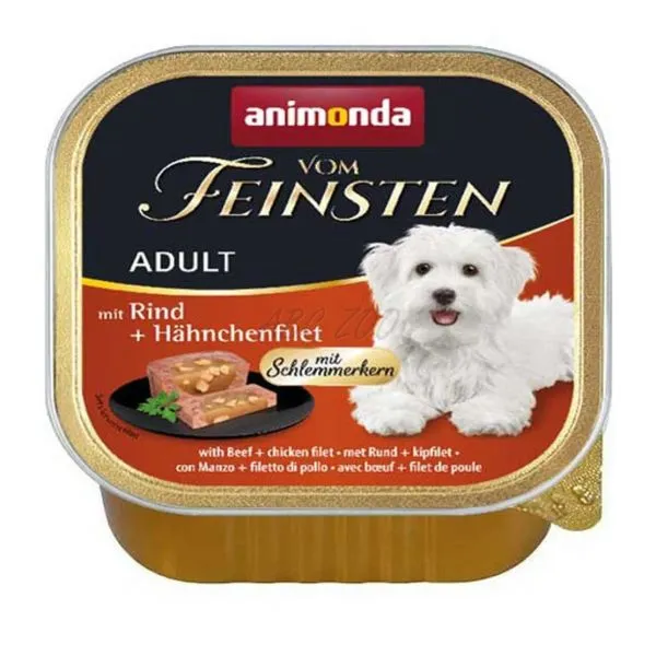 Animonda Vom Feinsten je vanička plnená hovädzím mäsom a kuracími filetami, pre dospelé psy všetkých plemien.