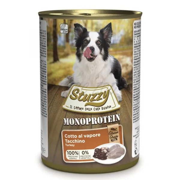 Konzerva Stuzzy Monoprotein je bezobilninové krmivo plné kvalitných ingrediencií s jedným zdrojom živočíšneho proteínu, určené pre psy s bielkovinovou intoleranciou.