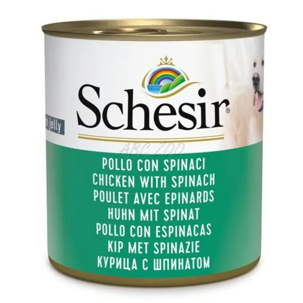 Schesir je prírodné krmivo v konzerve z kuracieho mäsa so špenátom pre všetky plemená psov.