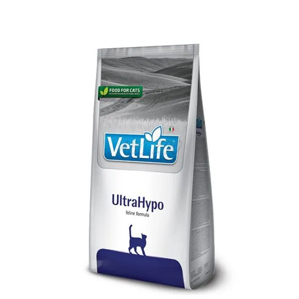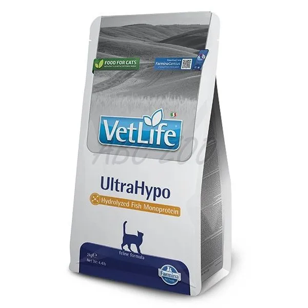 Farmina Vet Life UltraHypo je kompletná veterinárna diéta pre mačky s hydrolizovanou bielkovinou, odporúčaná na manažment pacientov s potravinovou alergiou, potravinovou intoleranciou a tiež na zlepšenie kvality kože a srsti v prípade dermatóz a nadmerného vypadávania srsti.