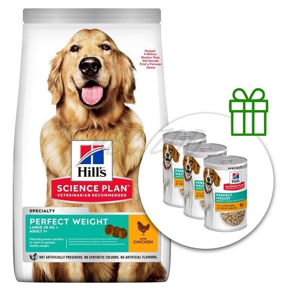 Hill's Science Plan Perfect Weight pre veľké dospelé psy s kuracím 12 kg + 3 konzervy ZADARMO