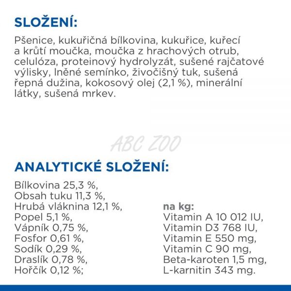 ZLOŽENIE: Pšenica, kukuričný glutén, kukurica, kuracia a morčacia múčka, múčka z hrachových otrúb, celulóza, proteínový hydrolyzát, sušené paradajkové výlisky, ľanové semienko, živočíšny tuk, sušená repná dužina, kokosový olej (2,1 %), minerálne látky, sušená mrkva.