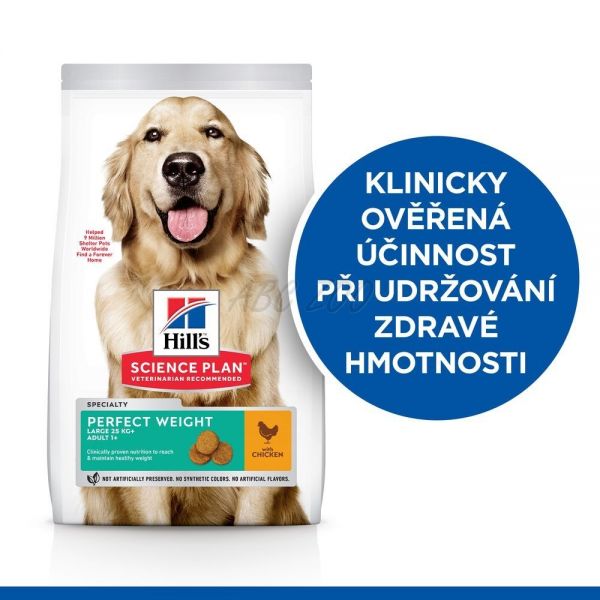 Prechod na nízkokalorickú diétu môže byť pre vášho psieho priateľa náročný. Preto Hill's Science Plan Perfect Weight krmivo pre dospelých psov veľkých plemien s kuraťom ponúka lahodnú, prelomovú výživu pre reguláciu hmotnosti, na ktore si váš dospelý pes pochutí. S bielkovinami pre udržanie svalovej hmoty, toto krmivo pre kontrolu hmotnosti je skvelá voľba pre vášho dospelého psa. Toto psie krmivo pre zdravú váhu bolo vytvorené na základe desaťročného špičkového výskumu a predstavuje lahodnú stravu, na ktoej si veľké dospelé psy skutočne pochutia. S novým vzhľadom Science Plan sa máte na čo tešiť. Niektoré naše produkty teraz naviac majú nové meno, tvar granúl a receptúru.