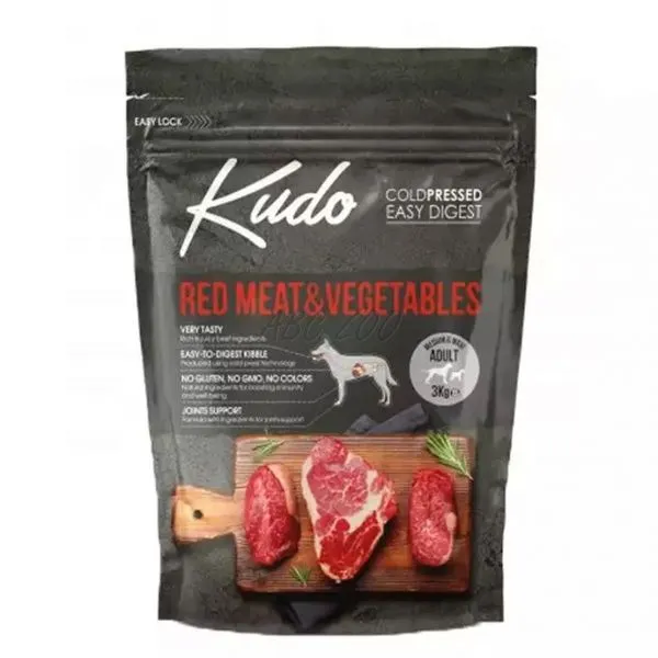 Kudo je kompletné krmivo s nízkym obsahom obilnín, pre dospelé psy stredných a veľkých plemien s obsahom červených druhov mäsa.