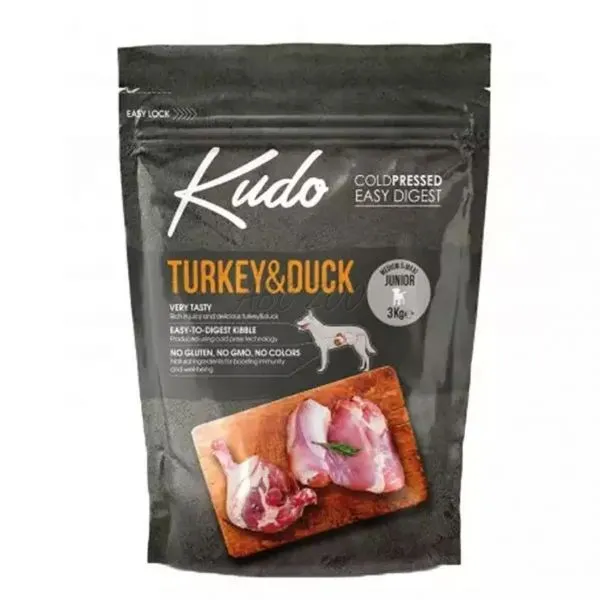 Kudo je kompletné krmivo s nízkym obsahom obilnín, pre šteňatá stredných a veľkých plemien s obsahom morčacieho a kačacieho mäsa.