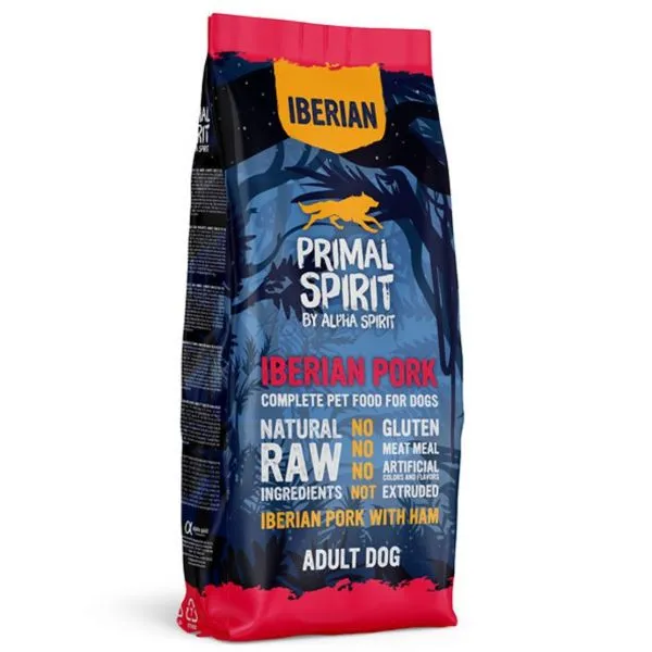 Primal Spirit Dog je unikátne zdravé krmivo pre všetky plemená dospelých psov s vysokým obsahom mäsa z ibérskeho prasaťa a španielskej šunky Serrano, doplnené o hydrolyzovanú ryžu.