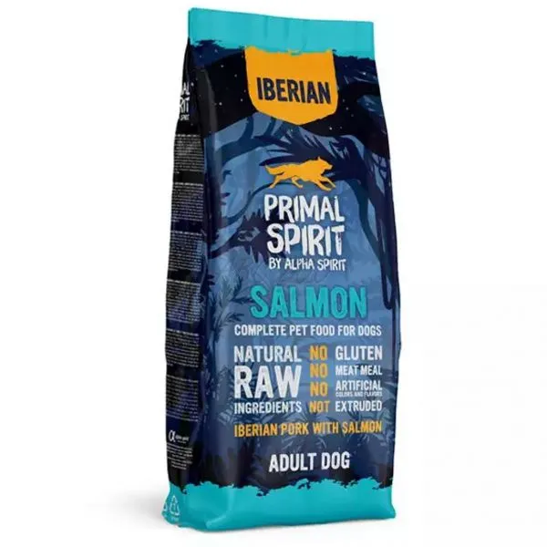 Primal Spirit Dog je unikátne zdravé krmivo pre všetky plemená dospelých psov s vysokým obsahom mäsa z ibérskeho prasaťa a čerstvého lososa, doplnené o hydrolyzovanú ryžu.