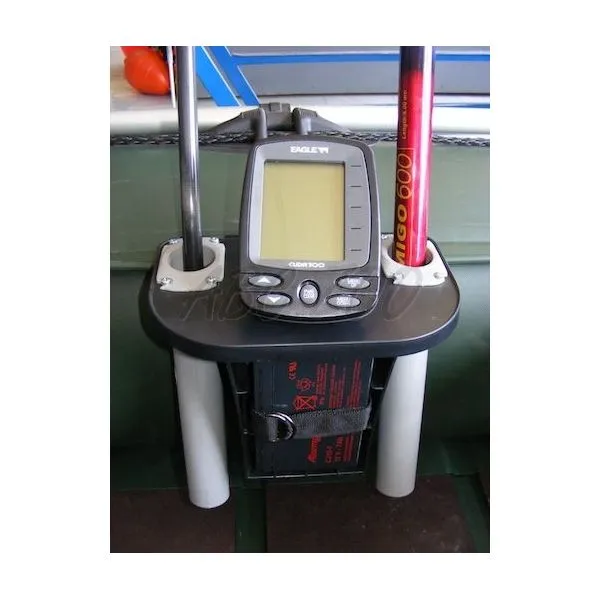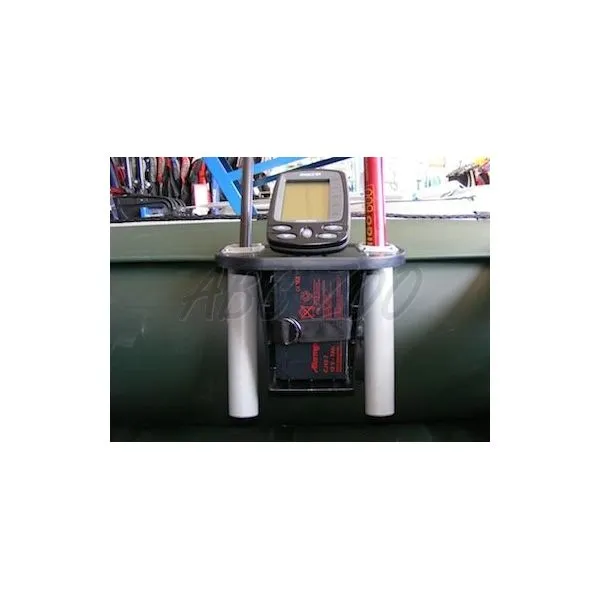 Univerzálny držiak sonaru a udíc. Veľkou výhodou tohto držiaku je jeho jednoduchá montáž. Držiak umiestnite na bočnú stranu člna KOLIBRI. Držiak obsahuje aj držiak na batériu, ktorá zabezpečí napájanie pre váš sonar.