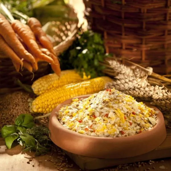 Zloženie: celozrnné kukuričné vločky, kukuričná múka, celozrnné pšeničné vločky, celozrnné ovsené vločky, hrachové vločky (6 %), ryžová múka (extrudovaná), mrkva* (3 %), proso (napučiavané), uhličitan vápenatý, monokalciumfosfát, chlorid sodný, plod bazy čiernej, saturejka, majorán, rozmarín, šalvia, tymián, aníz, bazalka, fenikel, kvet bazy čiernej, levanduľové kvety; (sušené bylinky celkom: 0,11 %); *) sušené