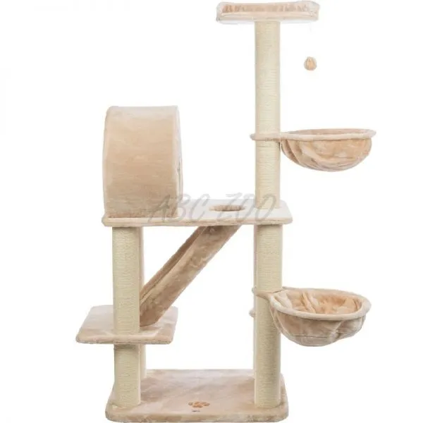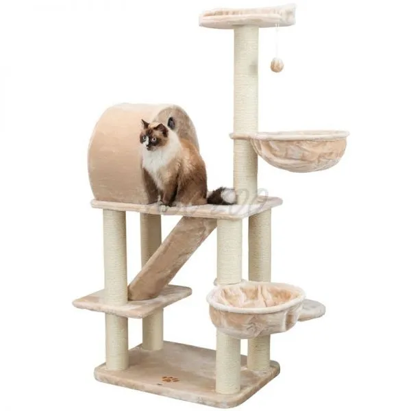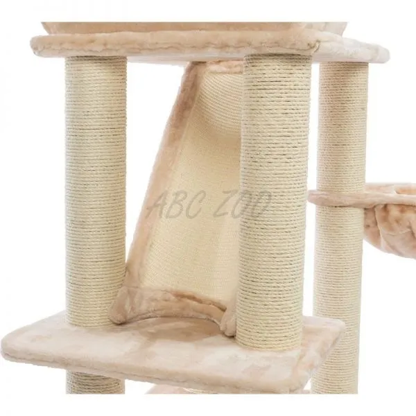 Členité škrabadlo pre mačky vyrobené zo sisalu a plyšu s niekoľkými odpočívadlami.