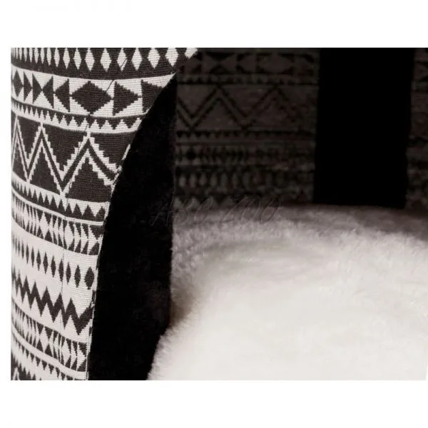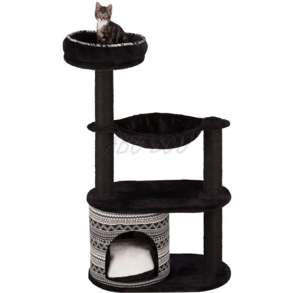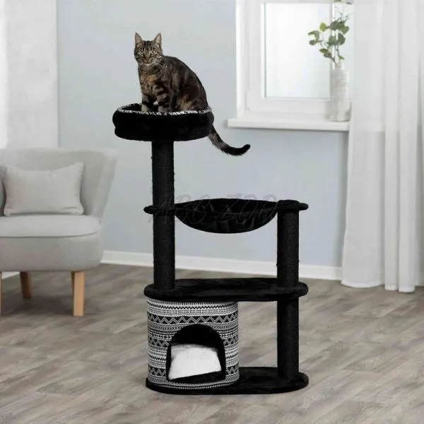 Škrabadlo pre mačky vyrobené zo sisalu a plyšu čiernej farby so vzorom.