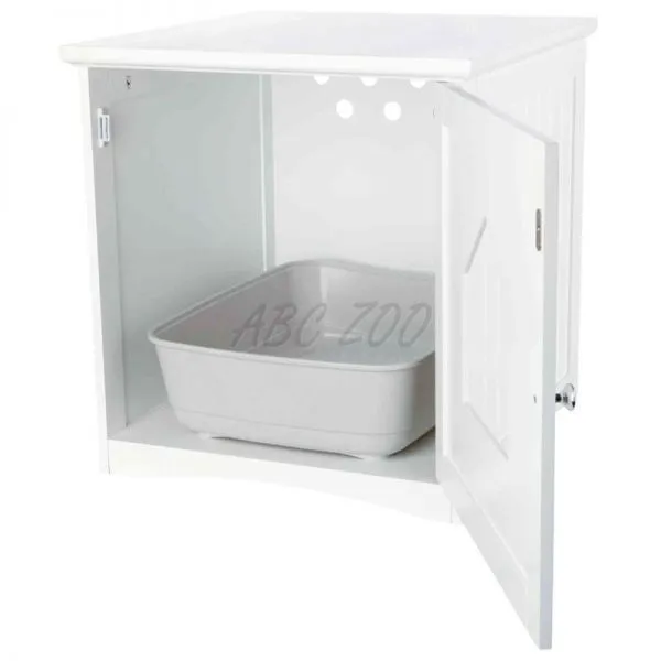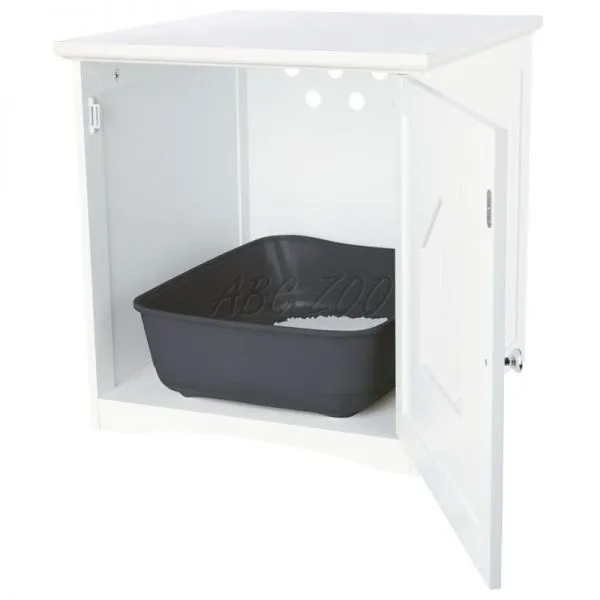 Drevená skrinka bielej farby slúži ako domček pre ukrytie mačacej toalety.