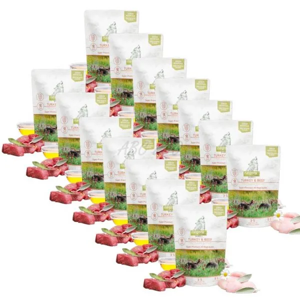 Zloženie: 35 % morčacie mäso, 35 % hovädzie mäso, 27 % vývar, 1,1 % sladké zemiaky, 1 % minerálne látky, 0,6 % lososový olej, 0,3 % horské byliny