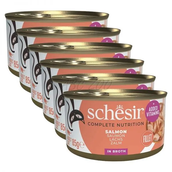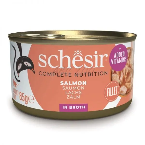 Schesir je lahodná konzerva pre dospelé mačky, plná lososa s ryžou vo vlastnom vývare.