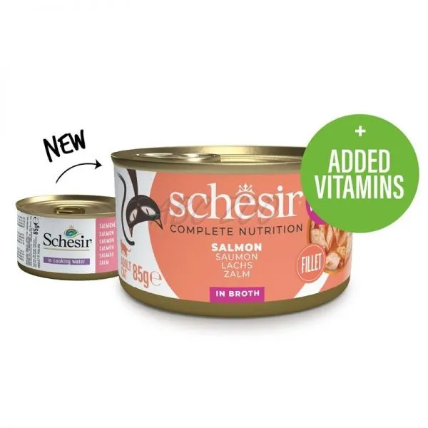 Schesir je lahodná konzerva pre dospelé mačky, plná lososa s ryžou vo vlastnom vývare.