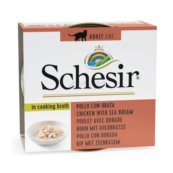 Schesir je lahodná konzerva pre dospelé mačky, plná kuracieho mäsa s pražmou vo vlastnom vývare.