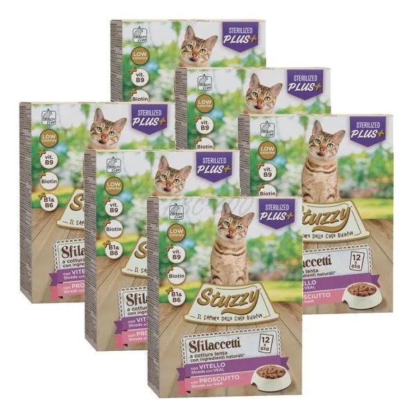 6x Stuzzy Cat Shreds Sterilized trhaná bravčová šunka 85 g