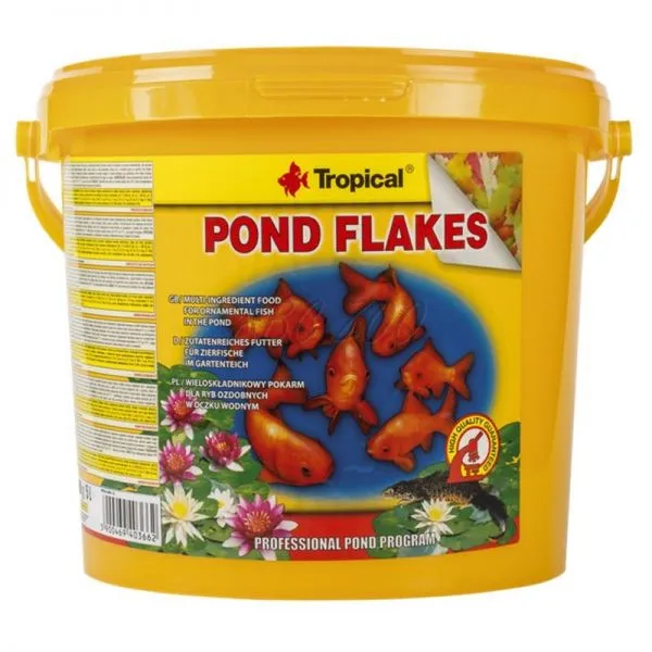 Rôznorodosť vyselektovaných surovín použitých pre výrobu vločiek zabezpečuje rybám zdravú diétu, ktorá pokrýva ich potreby na výživné zložky. Pravidelne podávaný Pond Flakes udržuje ryby v dokonalej kondícii a vplýva na ich rovnomerný rast a rozvoj. Krmivo používame od včasnej jari do neskorej jesene pri teplote vody nad 10ºC, ako aj počas zimovania neveľkých rýb v uzavretých miestnostiach. Postupne, ako ryby rastú, pridávame do ich diéty krmivá značky Tropical vo forme plávajúcich tyčiniek napr. Koi&Goldfish Colour Sticks, Koi&Goldfish Vegetable Sticks.