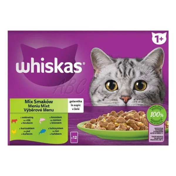 Whiskas kompletná a vyvážená kapsička v želé pre dospelé mačky od 1 roku.