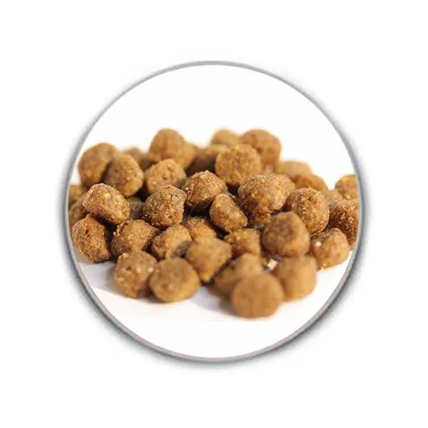 Zloženie: živočíšne proteíny* (hydina 16 %, jahňacina 4 %), kukuričná múka, kukurica, oleje a tuky, jačmeň, oškvarky, rybia múčka (5 %, z toho 50% lososová múka), ryža, hydrolyzovaný proteín, cukrovarské rezky* (odcukrené), jablková dreň*, chlorid draselný, droždie*, chlorid sodný, morské riasy*, ľanové semeno (0,16 %), vajcia celé* (0,1 %), pestrec mariánsky, droždie* (extrahované), mäso morských mušlí* (0,02 %), juka schidigera*, artičoka, púpava, zázvor (0,016 %), list brezy, pŕhľava, rumanček, koriander, rozmarín, šalvia, koreň sladovky, tymián (sušené bylinky celkom: 0,15 %);  *) sušené.