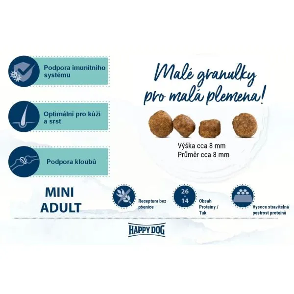 Happy Dog Mini Fit & Vital Adult je kompletné krmivo pre dospelých psov malých plemien do 10 kg s normálnou potrebou energie.