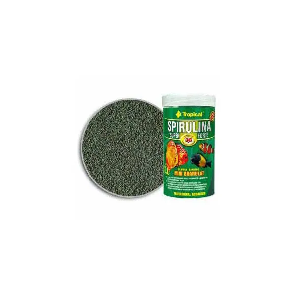 Krmivo Tropical Spirulina Super Forte Mini Granulat je rastlinné krmivo vo forme drobného granulátu s vysokým obsahom (36%) rias Spirulina platensis. Je určené špeciálne pre africké cichlidy požierajúce riasy, ako aj iné ryby, tiež morské, vyžadujúce v strave značný podiel zložiek rastlinného pôvodu.