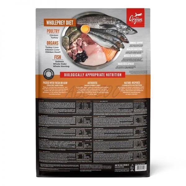 Obsahuje 85% kvalitných živočíšnych surovín, ako je čerstvé alebo surové kurča, losos a moriak. ORIJEN krmivo obsahuje živočíšne zložky WholePrey, ako sú orgány a kosti, zabezpečujúce, že vašim šteniatkam nechýba žiadna výživa.