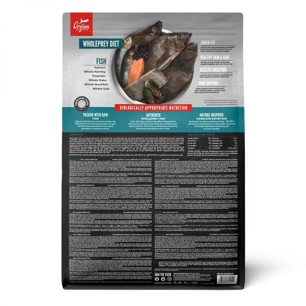 Zloženie: surový losos (17 %), celý surový sleď (16 %), surový platýs (7 %), celý surový hejk (6 %), celý surový okúnik (6 %), celý surový morský jazyk (6 %), dehydrovaný sleď (5 %), dehydrovaná sardinka (5 %), dehydratovaná treska (5 %), dehydrovaná makrela (5 %), dehydrovaná treska modravá (5 %), celá červená šošovica, celý hrach, celý cícer, celá zelená šošovica, vláknina zo šošovice, celé fazule pinto, slnečnicový olej, olej zo sleďa (2 %), celé fazule navy, surová slávka zelenoústa, sušená morská riasa, celá čerstvá maslová tekvica, celá čerstvá tekvica, sušený koreň čakanky, celé čerstvé jablká, celá čerstvá mrkva, celé čerstvé hrušky, celá čerstvá cuketa, juka (yucca schidigera), čerstvé mladé listy červenej repy, čerstvá kapusta, čerstvý špenát, čerstvé listy kvaky, celé brusnice, celé čučoriedky, celé plody muchovníku olšolistého, kurkuma, ostropestrec mariánsky, koreň lopúcha, levanduľa, koreň ibišku, šípky.