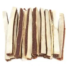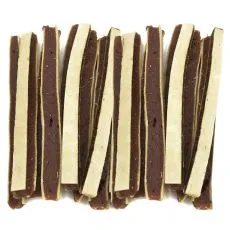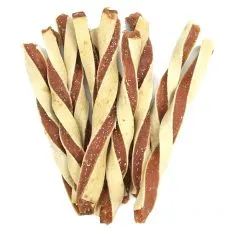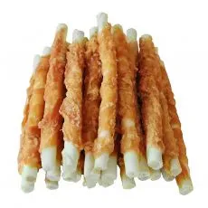 Doplnkové krmivo pre psy vo forme tvrdých tyčiniek z byvolej kože obalených kuracím mäsom.