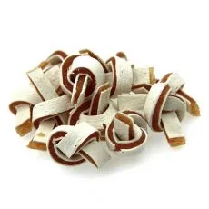 Doplnkové krmivo pre psy z byvolej kože viazanej do uzlov obalenej kačacím mäsom.