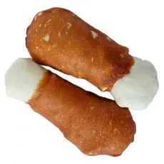 Doplnkové krmivo pre psy vo forme stehna z byvolej kože obalenej kuracím mäsom.