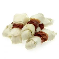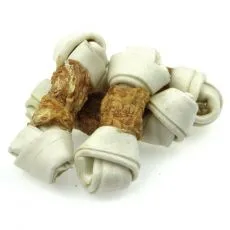 Doplnkové krmivo pre psy z byvolej kože viazanej do uzlov obalenej kuracím mäsom.