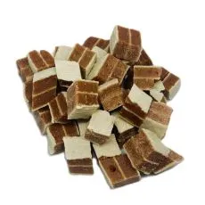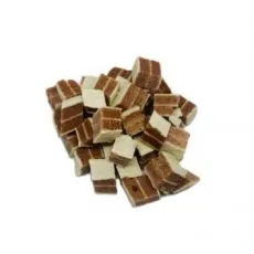 Doplnkové krmivo pre menšie psy a mačky vo forme kociek z králičej pečene a tresky.